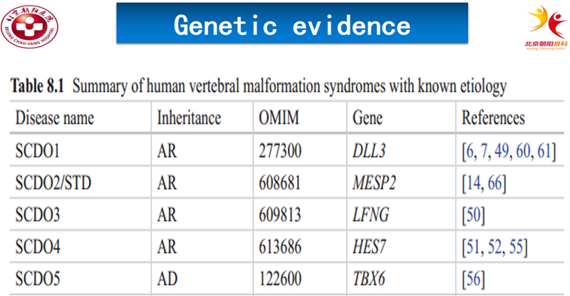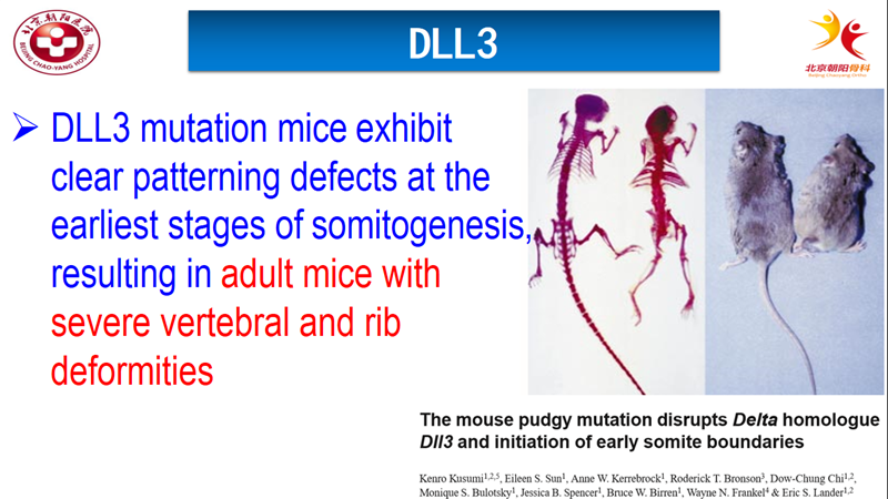 2004,有学者发现了一个近亲家系的两个SCD患者基因连锁分析没有发现DLL3突变。却在15号染色体有一个与SCD疾病相关的突变基因,就是MESP2。随后,有学者报道Mesp2基因敲除小鼠出现体节分节障碍,脊椎相互融合。从而验证了Mesp2基因与椎体发育形成有关。