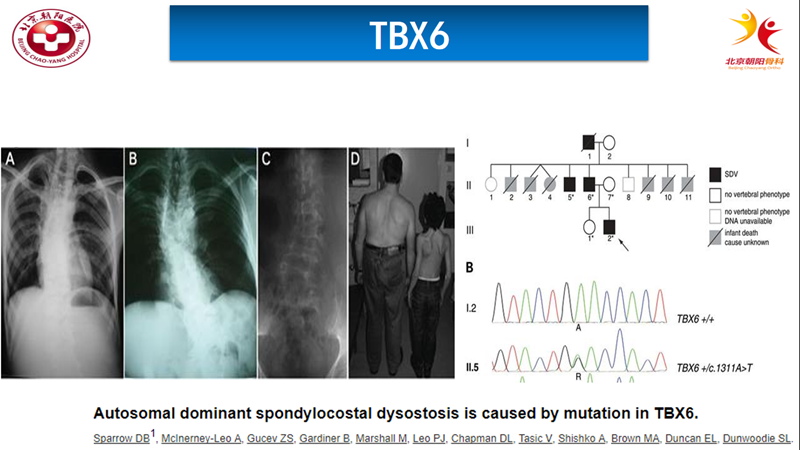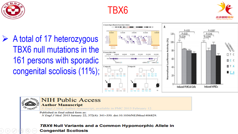 随着基因研究方法的进步,2015年,世界顶级医学刊物《新英格兰医学杂志》以原创性论著形式,发表了中国医学科学院北京协和医院为第一完成单位的研究成果“TBX6基因无效变异联合常见亚效等位基因导致先天性脊柱侧凸”。该研究发现TBX6基因的缺失、无义、或移码等不同形式的无效变异本身还不足以导致先天性脊柱侧凸,通常需要联合一个常见的TBX6亚效等位基因来共同致病。TBX6是迄今最重要的先天性脊柱侧凸致病基因,11%散发型CS与TBX6突变有关。