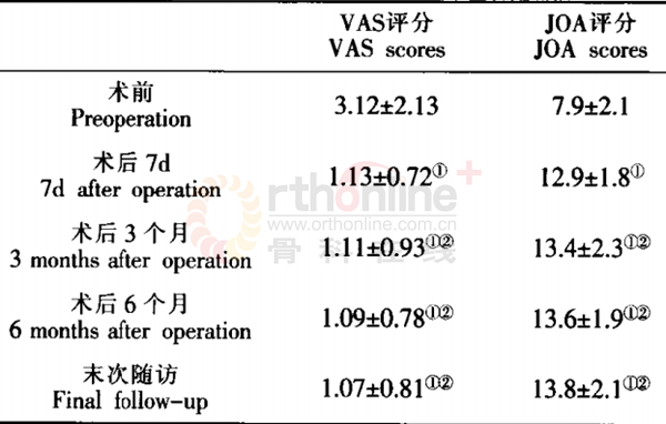 采用SPSS17.0统计软件进行统计分析,数据均以(x±s)表示,VAS评分、 JOA评分比较采用配对t检验。检验水准α值取双侧0.05。