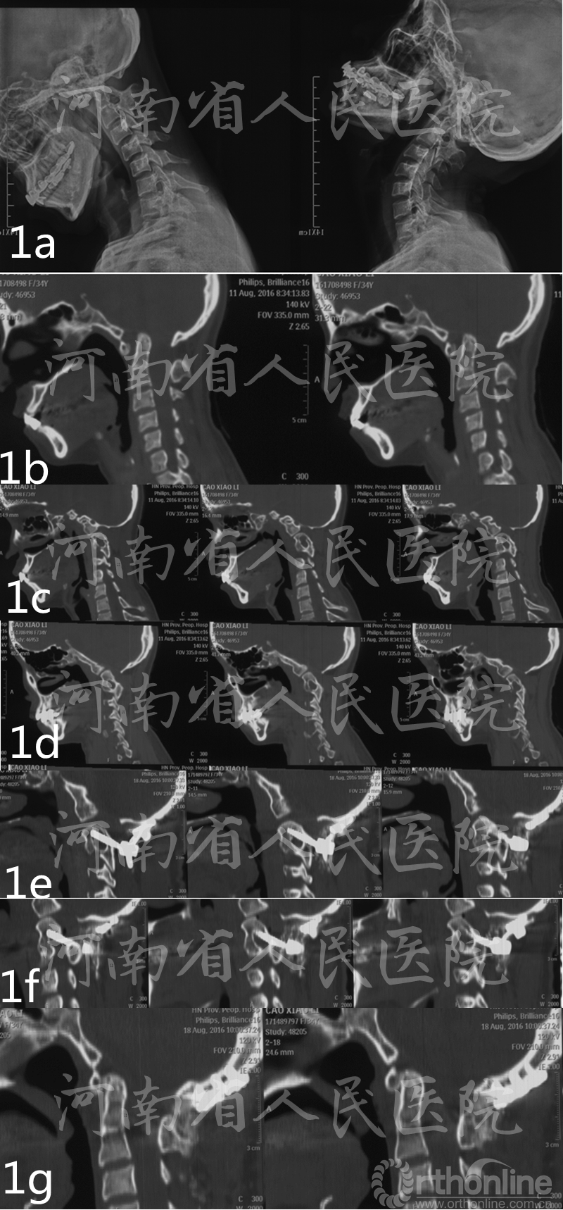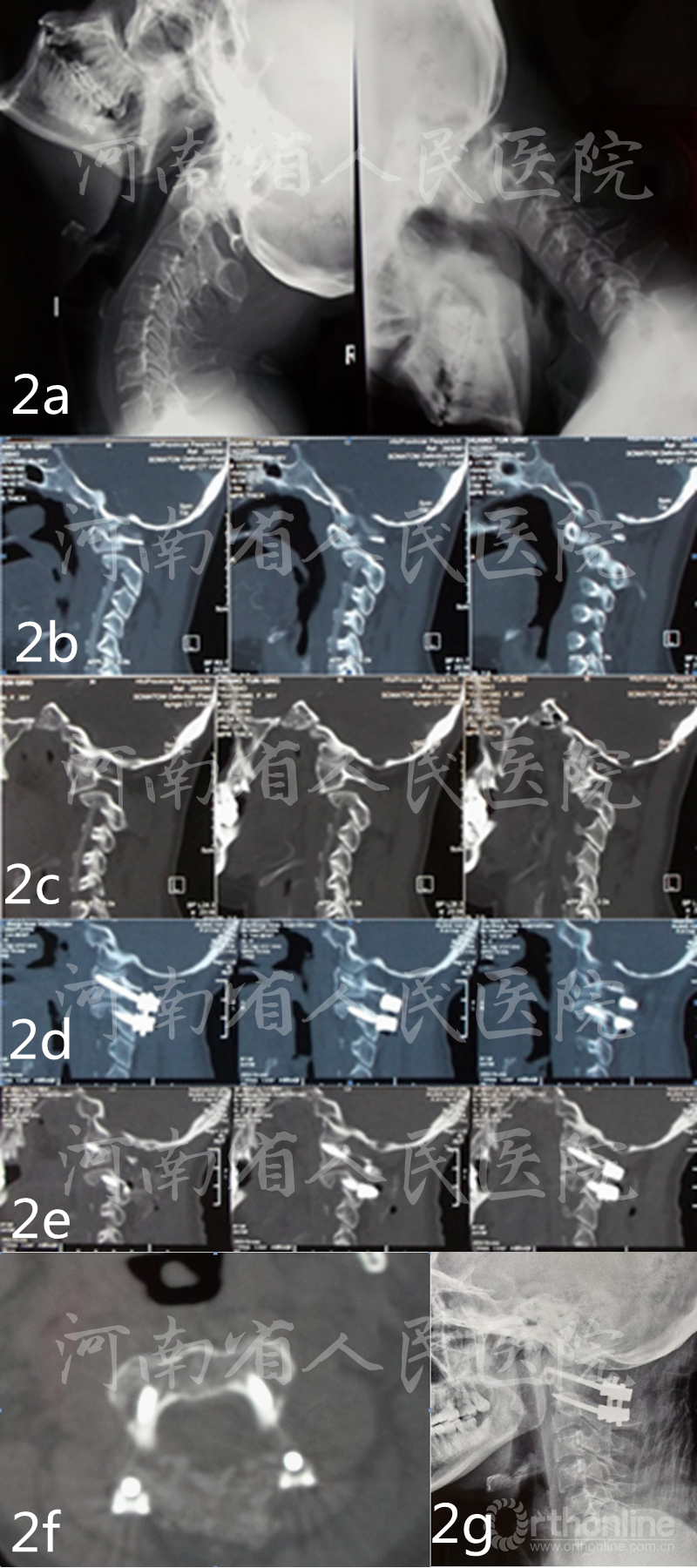 图1 患者女性,33岁,寰枕融合,颈2、3融合,寰枢椎不稳 a术前X线显示寰枢椎过伸位复位,过屈位脱位 b 术前矢状位CT示ADI增大 c术前矢状位CT示枢椎右侧椎弓根发育不良d术前矢状位CT示枢椎左侧椎弓根发育不良e 术后矢状位CT示枢椎右侧椎弓根钉为“in-out-in”三皮质螺钉 f术后矢状位CT示枢椎左侧椎弓根钉为“in-out-in”三皮质螺钉 g术后6月CT示骨性融合,复位无丢失
