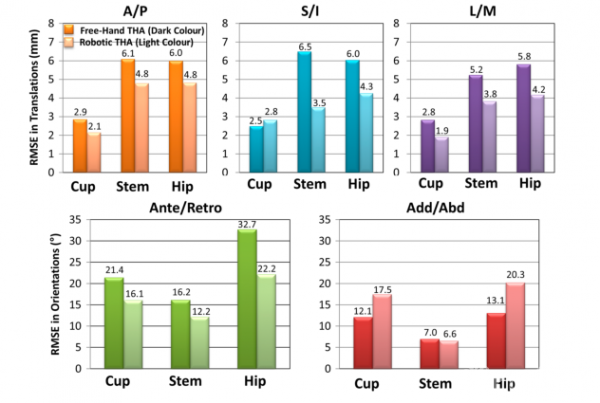 图4.机器人辅助THA组和徒手THA组患者两侧髋位移和角度的均方根误差。“Cup”-髋臼杯,“Stem”-股骨干,“Hip”-整体髋部。深浅颜色分别代表徒手THA组和机器人辅助THA组。A/P前后位移,S/I上下位移,L/M内外侧位移。Ante/Retro前倾/后倾,Add/Abd外展/内收。