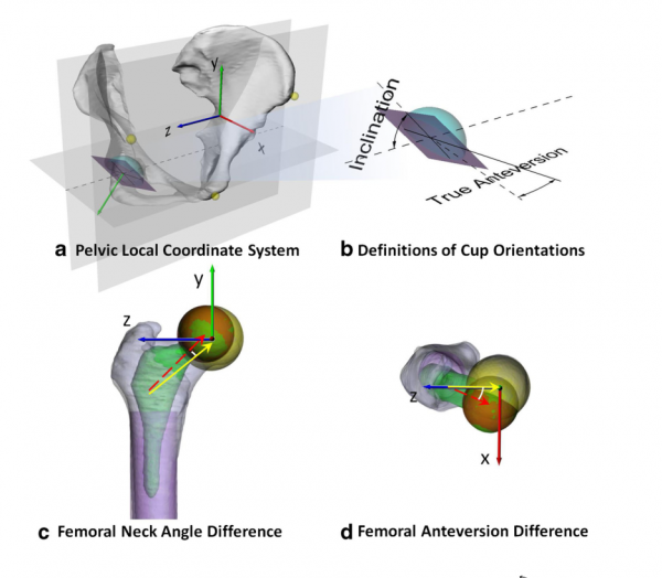图2.a骨盆坐标系的原点位于两侧髂前上棘连线的中点,x轴垂直于骨盆前平面;X,Y和Z轴分别向前、上方和右侧。b 臼杯外展角和前倾角示意图。c 股骨坐标系原点为股骨头中心点,Y轴平行于股骨干。计算股骨颈角度的差异,红色虚线和黄色实线分别表示植入的股骨颈轴和健侧股骨颈轴。d X轴垂直于股骨干轴线与原点构成的平面,计算健侧和患侧股骨前倾角。