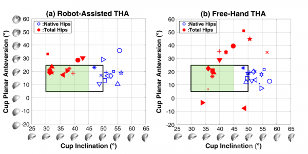 图3.健侧髋臼杯(蓝色图标)和患侧植入的髋臼杯(红色图标)的外展角和前倾角。(a)为机器人辅助THA组,(b)为传统徒手THA组:每一例患者均测量健侧和患侧的髋臼杯角度,用同一种图案标记;黑色方框代表 Lewinnek安全区,绿色阴影代表 Callanan安全区。
