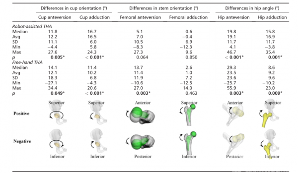 机器人辅助THA组患侧与健侧对比(表1):植入的髋臼杯前倾角比健侧显著增加12.2±11.1° (p=0.005),外展角减少 16.5±6.0° (p<0.001),患侧股骨前倾角增加 7.0±10.5°(Table 2; p=0.003),颈干角增加0.4±6.9°。对整个髋部结构,患侧的整体前倾角显著增加 19.1±11.7°(p<0.001),联合外展角增加 16.9±11.7° (p=0.001).机器人辅助THA组植入的各组件角度的差异显著低于徒手THA组。