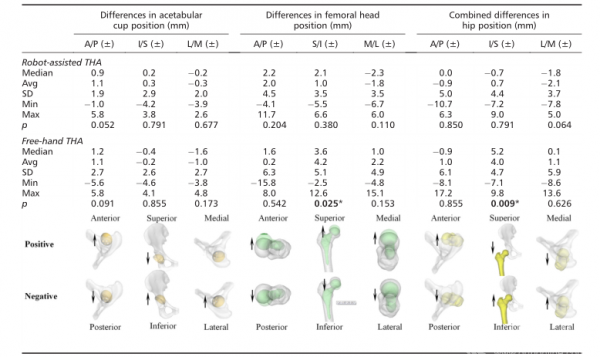 为了优化髋臼杯和股骨干的位置,各类导航手术被广泛应用于临床并被证实可有效提高组件植入位置的精度。导航THA可成功地降低安全区外的例数;但是一些研究报道,机器人辅助THA和传统徒手THA对比,临床效应无显著提高。全髋置换术(THA)能够为严重髋关节炎、股骨头缺血性坏死和其他髋关节疾病的患者恢复髋关节解剖结构和功能。因此,重建髋关节解剖结构的内容包括前倾角、髋关节中心位置、股骨头中心和下肢长度,这些对髋关节功能至关重要。目前对机器人辅助THA是否能更好的重建髋关节三维角度和位置尚不明确。因此本文通过量化比较植入的髋关节与健侧髋关节的差异的方法来判断机器人辅助THA是否优于传统徒手THA。