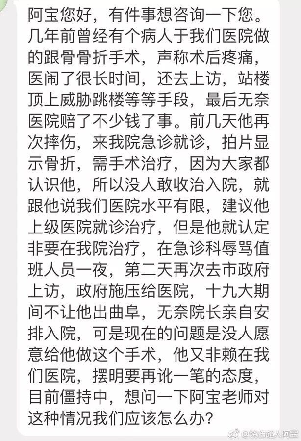 近日,据@烧伤超人阿宝爆料:山东曲阜一位患者几年前在某家医院做跟骨骨折手术,声称术后疼痛,医闹了很长时间,还去上访、站楼顶威胁等,最后医院无奈赔了钱。近日,该名患者因摔伤而致骨折被急诊收治入院,需要手术治疗,但因为大家均认识他,也就没人敢给他继续治疗,并建议他到上级医院治疗。