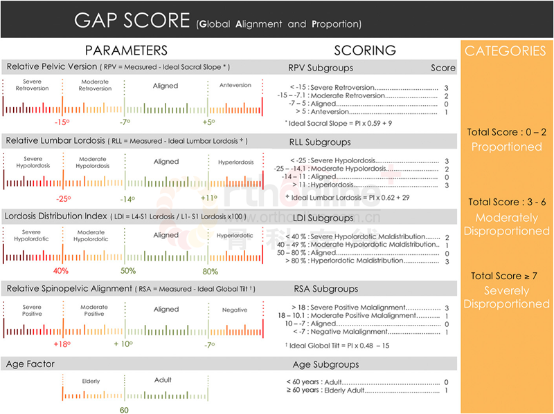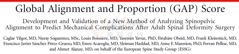 为探索能够预测成人脊柱畸形矫术后机械性并发症发生概率的方法,建立并验证一种全新的脊柱矢状面序列评估标准,来自土耳其的Gaglar Yilgor医生在2017年提出了脊柱整体(矢状面)序列及比例评分(Global Alignment and Proportion Score, GAP Score),研究成果发表于JBJS杂志(the Journal of Bone and Joint Surgery)。(Yilgor C, et al. Global Alignment and Proportion(GAP) Score: Development and Validation of a New Method of Analyzing Spinopelvic Alignment to Predict Mechanical Complications After Adult Spinal Deformity Surgery. J Bone Joint Surg Am. 2017, 99(19):1661-1672)
