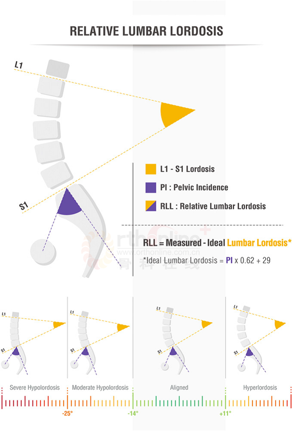第二个维度是相对腰椎前凸,指实际LL与理想LL之差。差值小于-25°定义为重度前凸不足(3分),-25°至-14.1°定义为中度前凸不足(2分),-14°至11°定义为平衡(0分),大于11°定义为前凸过大(3分)。