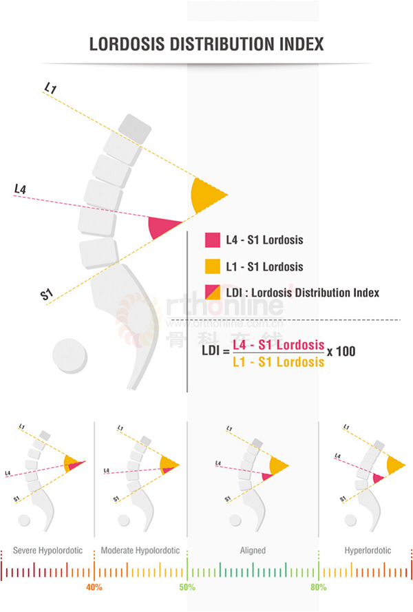 第三个维度是腰椎前凸分布比率,指L4-S1腰椎前凸角占L1-S1腰椎前凸角的比例。该比例小于40%定义为重度腰前凸分布不均(2分),40%至49%定义为中度腰前凸分布不均(1分),50%至80%定义为平衡(0分),大于80%定义为下腰椎前凸过大(3分)。