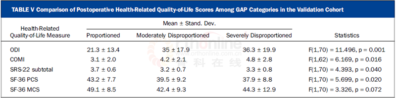 与此同时,GAP评分系统还与患者健康相关生活质量评分密切相关,越是平衡的脊柱,患者术后HRQoL评分越理想(SF-36 MCS除外)。