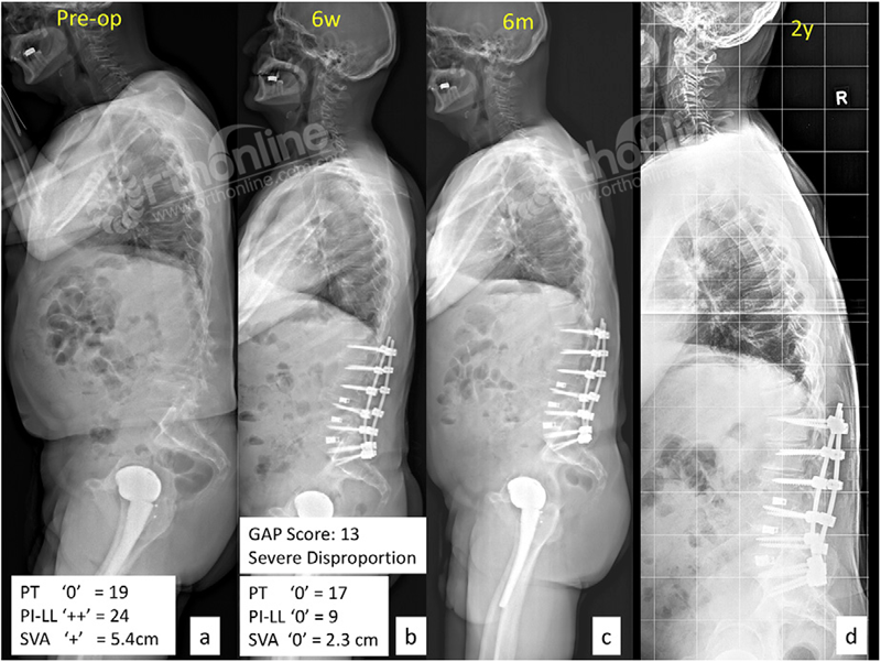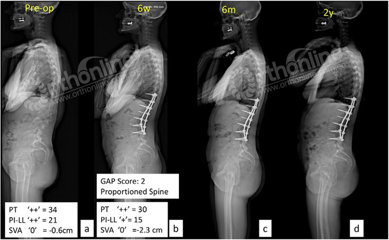 图7.一例60岁女性脊柱畸形患者(PI:26°),术前(A),术后6周(B),术后6月(C)和术后2年(D)。按Schwab分型,术前PT:19°(),PI-LL:24°(++),SVA:5.4cm(+)。术后6周矫形至PT:17°(),PI-LL:9°(),SVA:2.3cm ()。但是按GAP评分系统患者为13分(重度失平衡脊柱)。术后2年患者出现进展性PJK