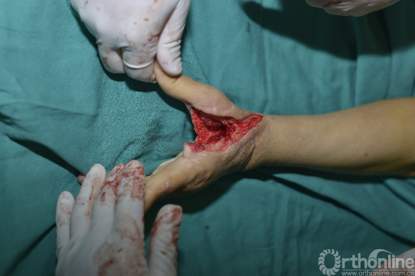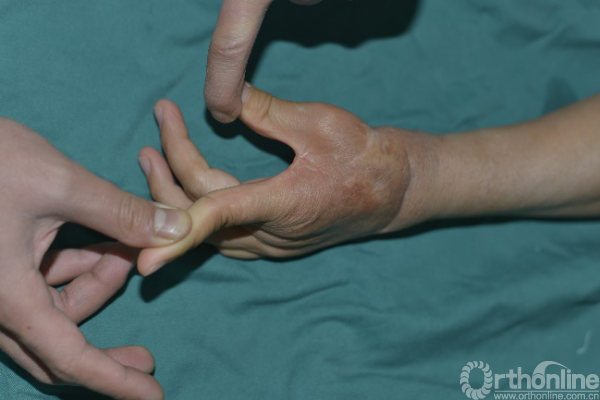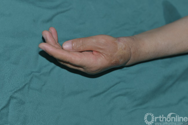 术前患者左手虎口挛缩