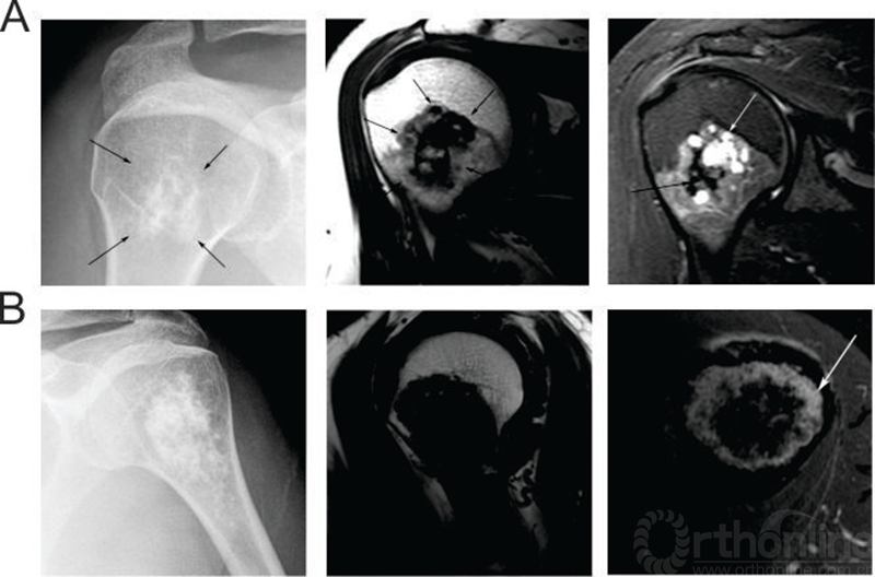 图1:内生软骨瘤(A)与软骨肉瘤(B)的影像学表现