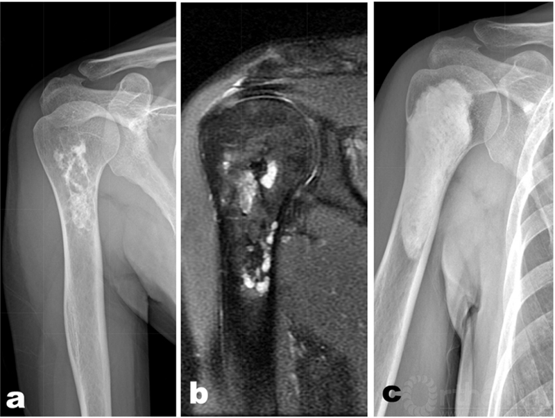 图2:47岁中年女性,术前X片提示软骨结节样钙化(a),术前MRI提示骨皮质部分受累(b),使用囊内扩大刮除+骨水泥填充,术后5年X片未提示复发(c)