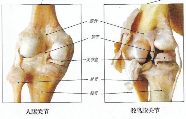 与人类膝关节最为类似的是鸵鸟的膝关节(图4)。所以土豪的实验室是不是可以考虑用鸵鸟来模拟人类膝关节疾病,这里是一张示意图,推荐感兴趣的朋友可以看看隋鸿锦教授编著的《达尔文的证据》一书,书中有精美的人类膝关节和鸵鸟膝关节的塑化标本图像(图6),也可直接去大连金石滩生命博物馆看真实而震憾的塑化标本。