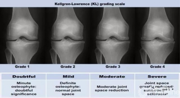 图8 膝关节老化,内侧间隙逐级变窄,由于膝关节的软骨在X线上不显影,你看不到他,只能通过他占的空来推断磨损程度,磨的越多,间隙越窄