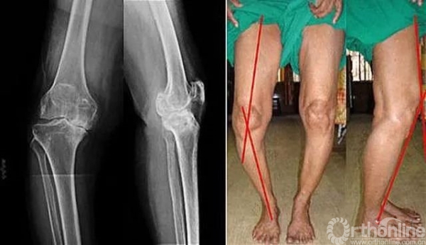 图9 老化的膝关节,左图为X线表现,骨缝已快看不到了,表明膝关节的软骨磨没了;右图可见典型的改变,一是膝关节外撇,二是膝关节伸不直