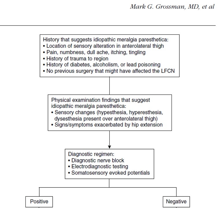 如果通过临床表现以及查体仍不能确诊MP时,可以通过LFCN的神经电生理检查诊断和排除。常用神经电生理检查包括躯体感觉诱发电位(81.3%敏感性)或感觉神经传导(65.2%敏感性)进行检查诊断。同时也可以通过局部的神经阻滞进行确诊。