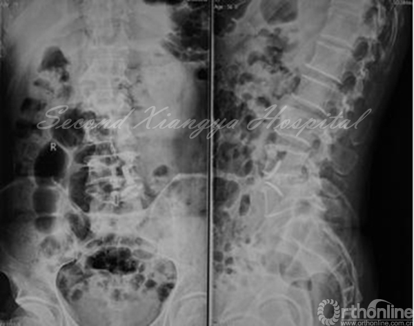 病史:男,56岁,腰背部胀痛10年,活动后加重,休息后减轻,每年发作1-2次,每次卧床休息一段时间后就可缓解。8个月前腰痛加重,出现右小腿后外侧疼痛,偶有麻木,休息后稍微减轻。保守治疗无效。