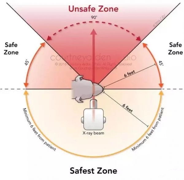 C臂射线发射器6feet=2米以外区域的散射辐射小于1 mSv,你再后退一步4米之外基本已经没有辐射了。