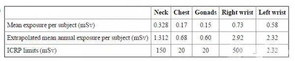 我们可以看到,在铅手套保护之下,我们的右手(术者为右立者)辐射量最大,但也不足1msv,下来是左手,颈部、胸、性腺。