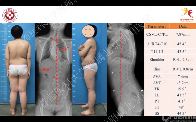 一位15岁内蒙古女孩,主因发现背部不平2年,伴腰痛1年。专科查体:四肢及躯干的感觉、四肢运动、反射及病理征无异常。脊柱全长正侧位X线片提示初步诊断为Lenke3型特发性脊柱侧凸。