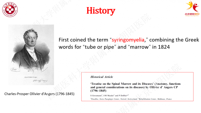 脊髓空洞最早是由法国研究者Étienne在尸体解剖上发现的,之后法国学者Portal将这种髓内囊性变与临床症状联系在一起。但真正意义上展开对这一疾病的研究,是从1824年法国医生Ollivier命名其为Syringomyelia开始的。