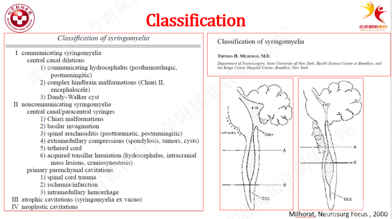 关于分型的相关的文献报道也很多,目前比较常用的是Milhorat教授团队在对175个合并空洞患者的尸体解剖中于2000年发表的分型文献报导。根据第四脑室与脊髓中央管是否联通以及其他特殊类型的空洞将其分为: