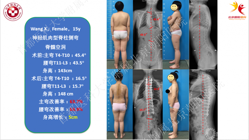 这位15岁的女性患者于北京朝阳医院就诊后,先行皮肤牵引治疗,牵引后腰痛症状加重,于是建议患者先行后颅窝减压术HBD,术后6月再进行脊柱侧凸矫形。HBD术后,患者的空洞在MRI影像上虽然无明显缩小,但术前牵引并未使患者的腰痛症状加重,也没有引起其他神经功能异常表现,于是海涌教授团队对这位患者成功实施了脊柱侧凸三维矫形手术治疗。