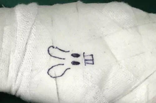就在大家一筹莫展的时候,护士姐姐开始放大招了!曹芳耐心温柔地对小朋友说,护士姐姐是在她的手上帮她带了一个小手套。然后拔出笔来,迅速地在纱布上画了一只小兔子!并且告诉小朋友,这样手套就变得特别漂亮啦,而且只有表现特别棒的小朋友,才能获得这个奖励哦!听到护士姐姐的话,小朋友马上开心地笑了,还特别得意洋洋地高举着小手向别人展示这份可爱的礼物。