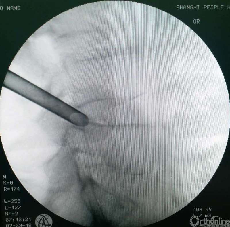 第一步:椎间孔穿刺,无需按标准靶点穿刺,只要穿刺针穿入椎间孔下半部分即可,只需要透视侧位片,不需要拍正位片,明显减少穿刺次数和透视次数。如图1