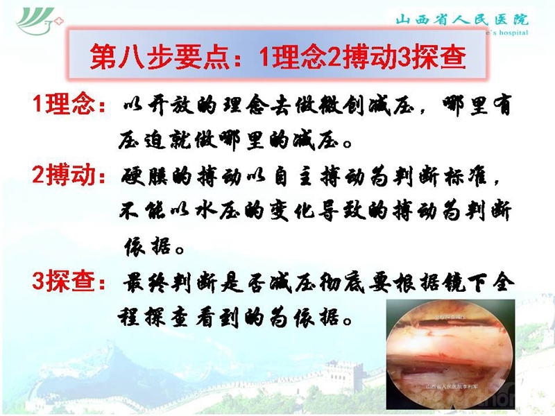 一些可视系统也做了很好的直视下成型的改进和创新,在使用中仍然存在一些不足,如何利用开放的操作方法和内镜技术很好的结合,在内镜直视下完成椎间孔的成型过程,有效的减少神经损伤的风险是脊柱外科医生追究的目的,山西省人民医院骨科李利军主任根据自己的理解和孔镜技术操作改进,提出一种全内镜下完成椎间孔成型,逐步向椎管内推进,根据减压的靶点,完成神经全程减压的技术,即“Full see(Full spinal endoscopic technique)八步法”,现就相关内容作如下介绍。