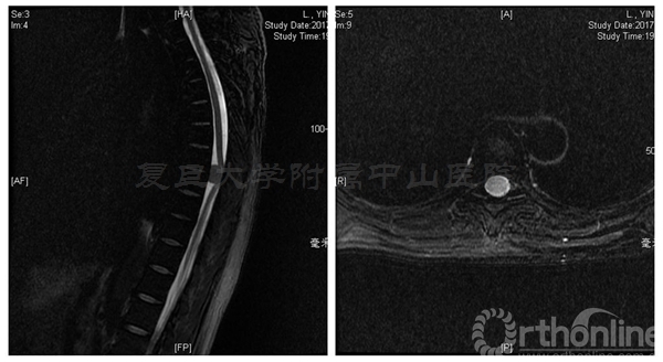 术前MRI:T7-8水平椎管内占位伴脊髓变性,脊膜瘤可能的大