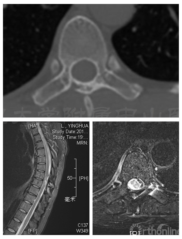 术后半年CT显示两侧椎板截骨面均已骨性愈合,椎管体积无减少。MRI显示椎管内脊膜瘤无复发