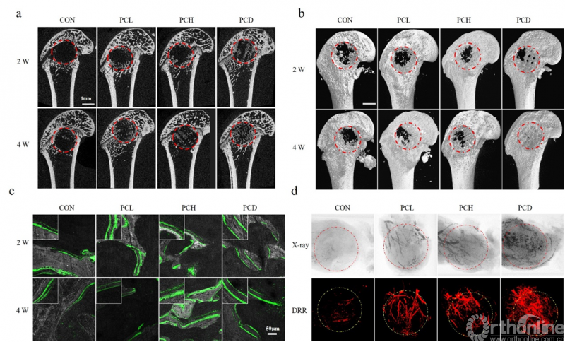 图2.可血管化3D打印支架大鼠股骨远端骨缺损部位的骨修复和血管生成评价