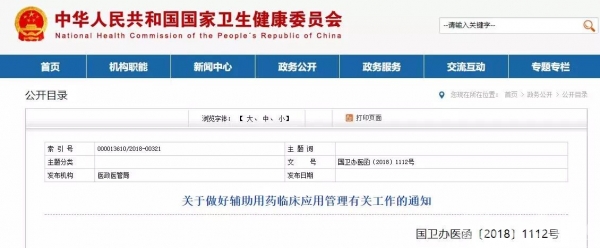 11月12日,国家卫健委下发了《关于做好辅助用药临床应用管理有关工作的通知》(下文简称《通知》),要求制定省级辅助用药目录、国家级辅助用药目录,重点内容如下: