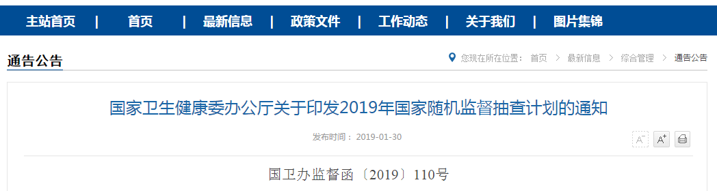 近日,国家卫健委发布《国家卫生健康委办公厅关于印发2019年国家随机监督抽查计划的通知》(以下简称《通知》),公布了2019年国家随机监督抽查计划,涉及各级各类医疗机构。