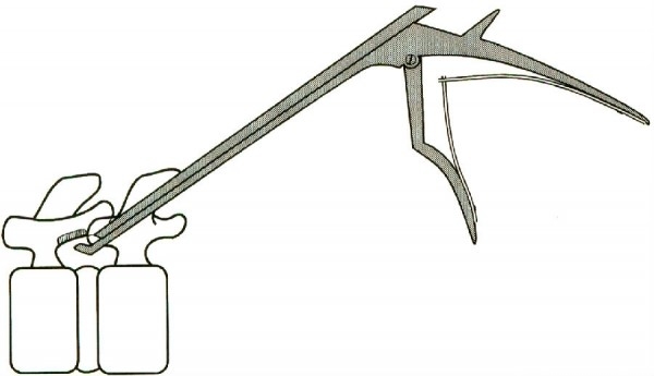 操作Kerrison咬骨钳绝不能过度用力,因为它可能会滑离骨面而损伤硬膜。如果在咬骨之前需要施加一定的力量,在用力之前务必将Kerrison咬骨钳的尖端朝向安全区域(如骨质)。用Kerrison咬骨钳的侧方咬切面咬骨时,如果过度用力的话Kerrison咬骨钳可能会滑入硬脊膜并将其撕裂。