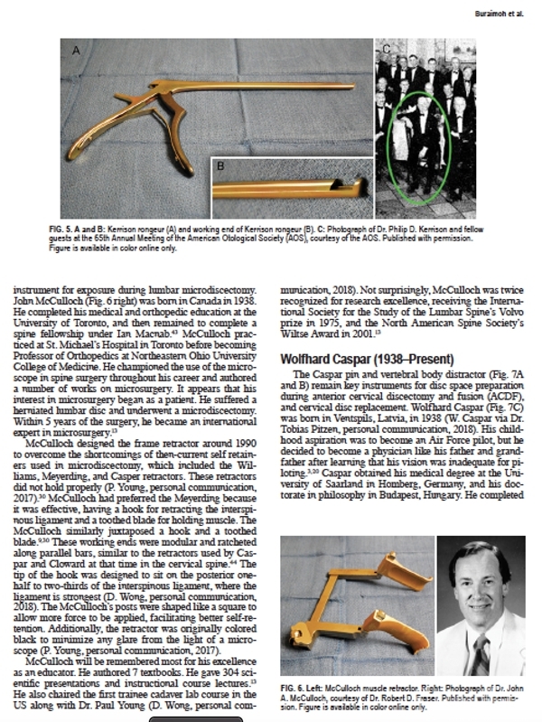 在这篇介绍脊柱手术工具来历的文章中,我们发现Dr. Kerrison和Dr. McCulloch在同一页介绍,这也是一种机缘巧合啊,因为我们今天要介绍的的关于Kerrison咬骨钳的使用技巧,就是来源于Dr. McCulloch的总结。