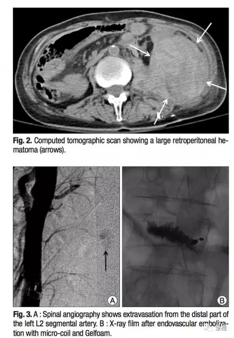 该患者做完PVP术后失血性休克症状。复查CT发现巨大的腹膜后血肿。血管造影发现L2左侧节段动脉远端破裂,行栓塞修复。