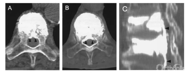 B经椎旁静脉渗漏:在椎体后缘相对对称分布。一般不超过椎管横径的1/3。矢状位CT显示会向头尾侧弥散。