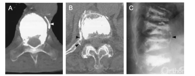 根据渗漏的途径及CT表现,将骨水泥渗漏分为三种类型:B经椎旁静脉渗漏;S经节段血管渗漏;C经皮质缺损渗漏。