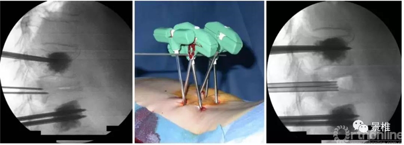 上下邻椎套杆相交加压,撬拨复位伤椎高度及前凸序列,伤椎注入骨水泥。