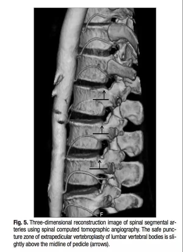 三维CT显示椎旁节段动脉就在椎体旁正中走行,所以椎弓根外侧穿刺安全边界在椎弓根中线以上。