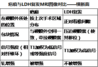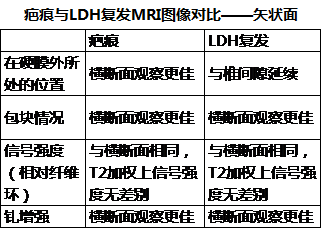 钆注射后矢状面图像更能准确反映再突出椎间盘碎片的大小,而横断面图像往往会低估。因此,我们总结了未增强MRI图像上复发LDH与瘢痕组织区别的主要方面,以助于读者结合矢状面及横断面图像互补来判断。