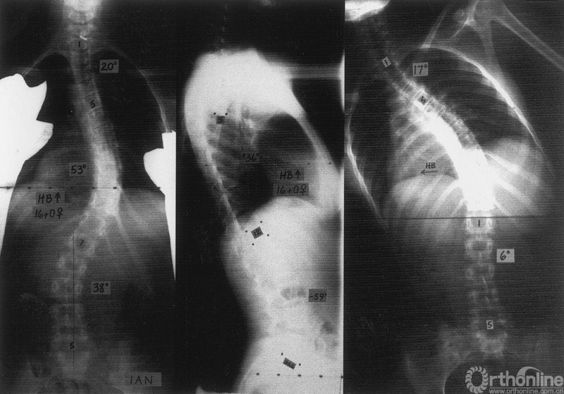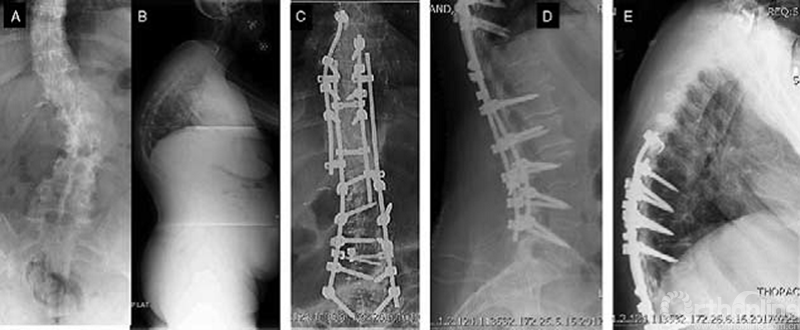 为达到有效矫形,手术措施可能有:行中胸椎-骨盆(长节段)固定,1或2个节段PSO,以及多个节段PCO。椎弓根螺钉间撑开可以间接纠正椎间孔狭窄,但严重的椎管狭窄可能需行椎板切除术。