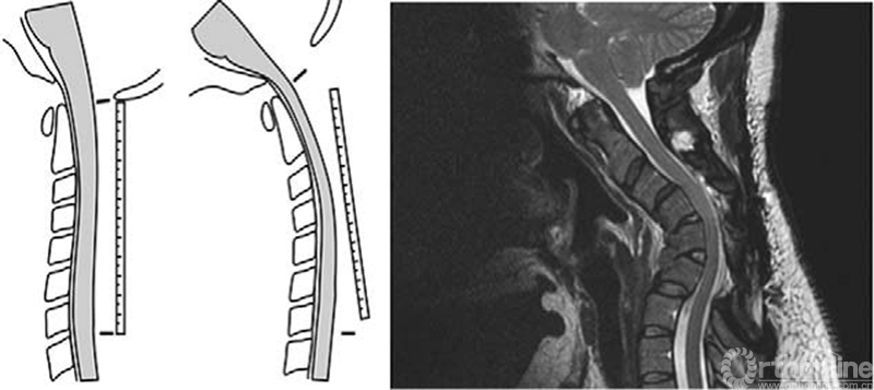 脊髓与矢状面平衡关系。脊髓覆盖在后纵韧带上(左);MRI(右)
