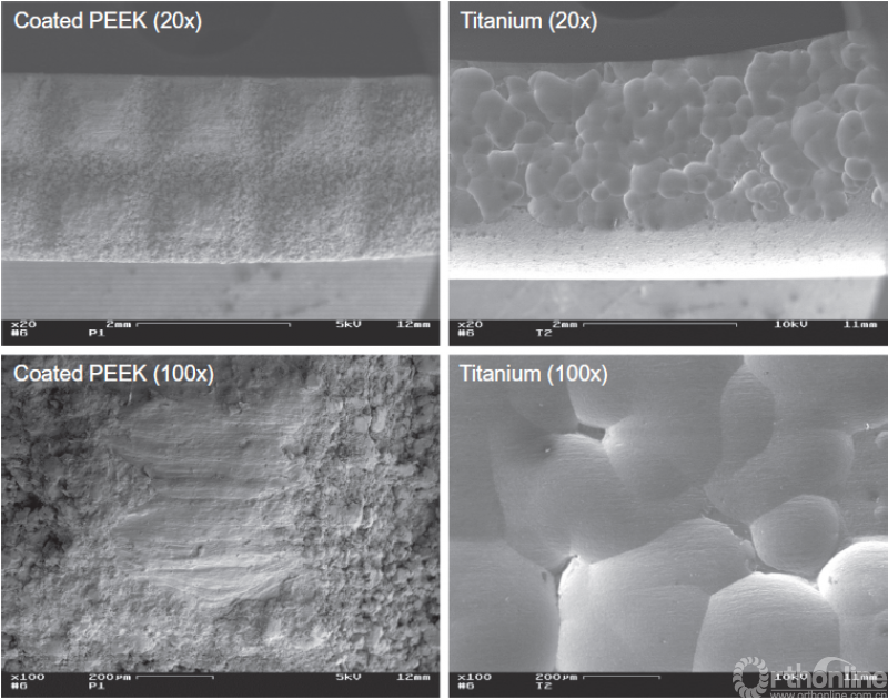 表面覆盖等离子喷涂钛(添加法)的聚醚醚酮(PEEK)植入物可因层离产生脱层磨损颗粒,而纳米技术(删减法)未见表面破坏