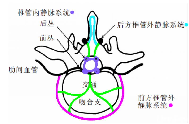 椎管内及椎体周围的静脉系统构成Batson静脉丛,该静脉丛无静脉瓣。1940年Batson最早介绍了该静脉丛在感染和肿瘤扩散过程中的重要性,他描述该血管丛是肿瘤细胞及细菌绕过大静脉系统(下腔静脉、上腔静脉和肺循环)定殖于椎体的一条旁路,会引起脊柱转移性肿瘤(最常见的是乳腺癌和前列腺癌)或骨髓炎的形成。