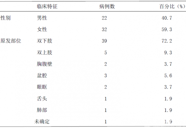 54例患者基本资料见表2,患者中女性多见,男女比例约1:1.5,原发部位多位于下肢,其次为上肢,余肢体部位相对较少,年龄未能准确统计。